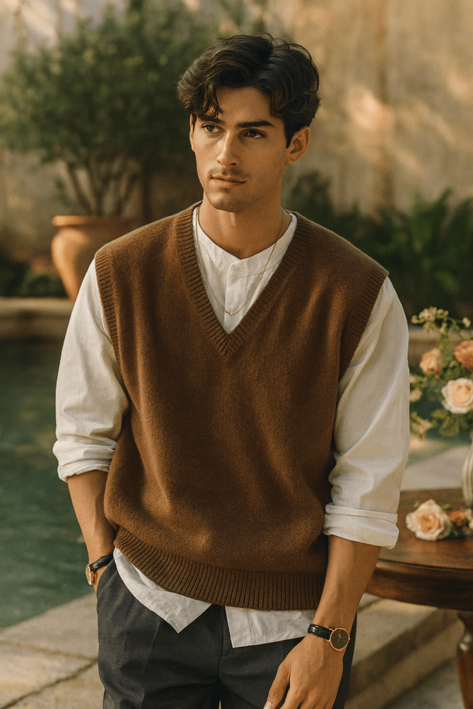 Layer up in effortless style this season with this vintage-inspired brown sweater vest — perfect for crisp fall strolls, cozy cafés, and fireside evenings. Click to shop the look now via our Amazon affiliate link and elevate your wardrobe with timeless charm. #FallFashion #MensStyle #AmazonFinds #TheVelvetAttic