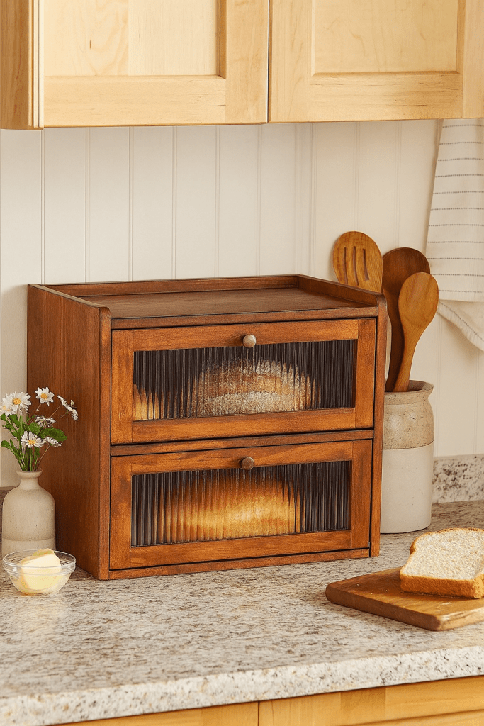 A warm wooden bread box that feels like it belongs in a countryside kitchen. Keeps bread fresh while adding a touch of old-world charm to your counter.